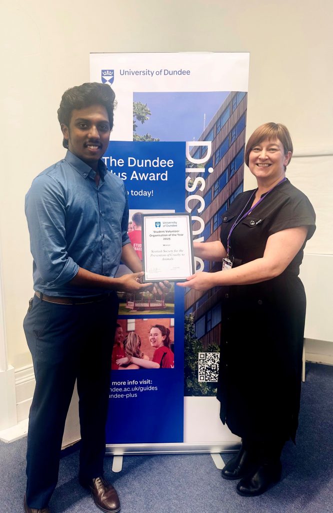 The Society was honoured to receive the Student Involving Organisation of the Year Award 2025 from Dundee University, a brilliant recognition of the successes from the SSPCA Student Ambassador Programme.