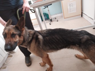 The German Shepherd was described as being extremely underweight with no visible body fat. She was given a Body Condition Score of 1/9. The nails on her front feet were also overgrown to the point of affecting her paw placement when standing and walking. The vet concluded that her poor condition was a result of chronic neglect and lack of nutrition.