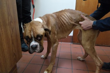 The Boxer dog was in a severely emaciated state, struggling to walk and appeared weak. She was taken to the vet after being removed from the property.