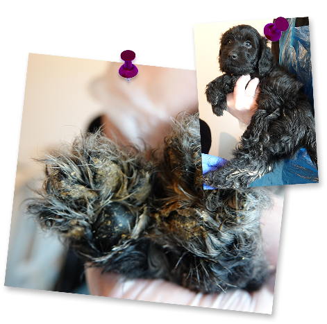 Following whimpers to a cupboard, we found a tiny Cockapoo puppy – Winnie. She had been hidden by the dealer in an attempt to avoid tougher charges. This was because Winnie was severely ill. Covered in infections, malnourished and terrified, she could hardly stand. She wouldn’t have survived much longer.